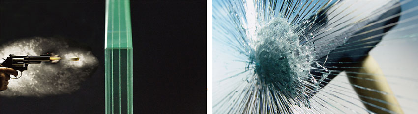 由于玻璃和PVB胶片粘合的非常牢固,且因玻璃具有较高的硬度而PVB胶片具有良好的韧性,当子弹接触到玻璃后,它们的冲击能量被削弱到很低的 程度乃至为零,所以不能穿透。同样,金属的撞击也只能将玻璃击碎而不 能穿透,因此起到防弹防盗效果。